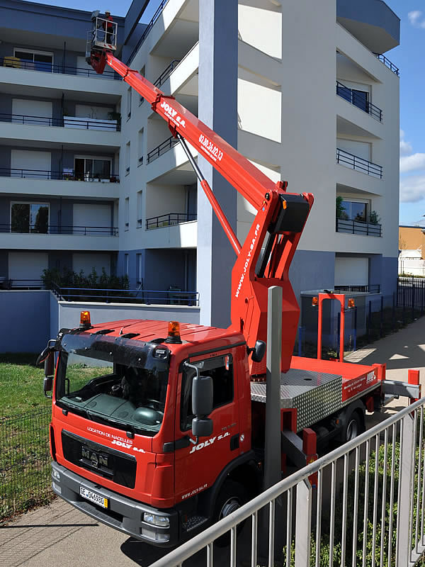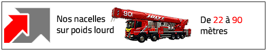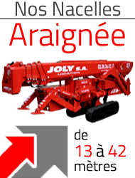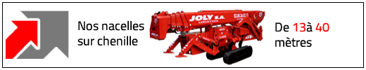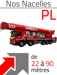JOLY LOCATION c'est une gamme de nacelles élévatrices de 12 à 90 mètres, complète et variée pour faire face à toutes les situations, camion nacelle Véhicules Légers VL avec ou sans opérateur, camion nacelle sur porteur Poids Lourds PL avec ou sans opérateur, nacelle grande hauteur PL, PL 4x4 Offroad, nacelle araignée sur chenille et nacelle négative.